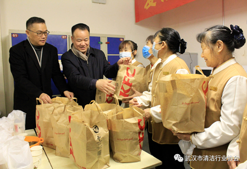 2月8日起,武汉市商贸金融烟草工会联合百胜餐饮(肯德基)为在春节期间坚守工作一线且就地过年的清洁行业职工开展爱心送年饭活动。市商贸金融烟草工会主席周国华一行来到清洁行业建会企业代表爱洁集团,向清洁行业职工及家人致以新春问候和祝福,向坚守生产一线的广大职工致以崇高敬意,祝愿他们在新的一年身体健康、家庭幸福、工作顺利。